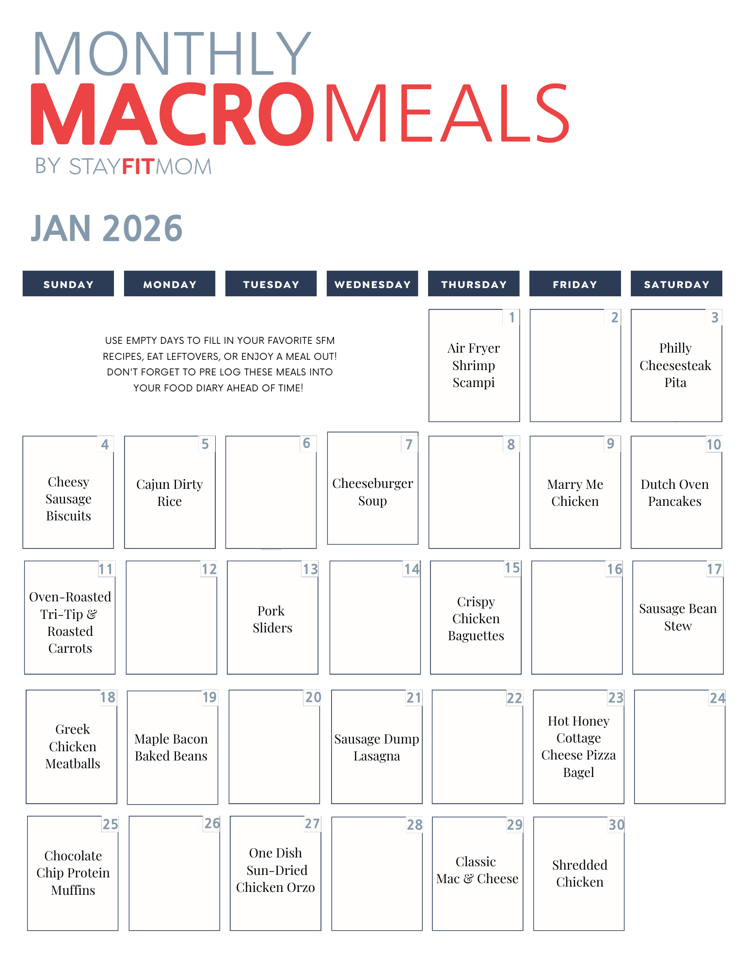 Meal planning for the whole month made easy! Our Monthly Macro Meal Plan is available for purchase each month or as a monthly subscription. Get 20 macro calculated recipes delivered right to your email inbox every single month! All recipes are pre loaded in both Myfitnesspal & the Macrosfirst apps' food databases for easy logging.